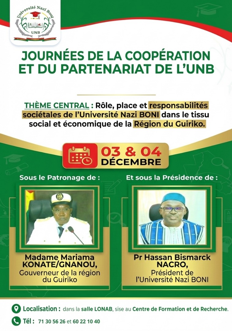 Sous le Patronage de Mme Mariama KONATE/GNANOU, Gouverneur de la Région du Guiriko et la Présidence du Pr Hassan Bismarck NACRO, Journées de la coopération et des partenaires de l'Université Nazi BONI, les 03 et 04 /12/ 2025 au CFR