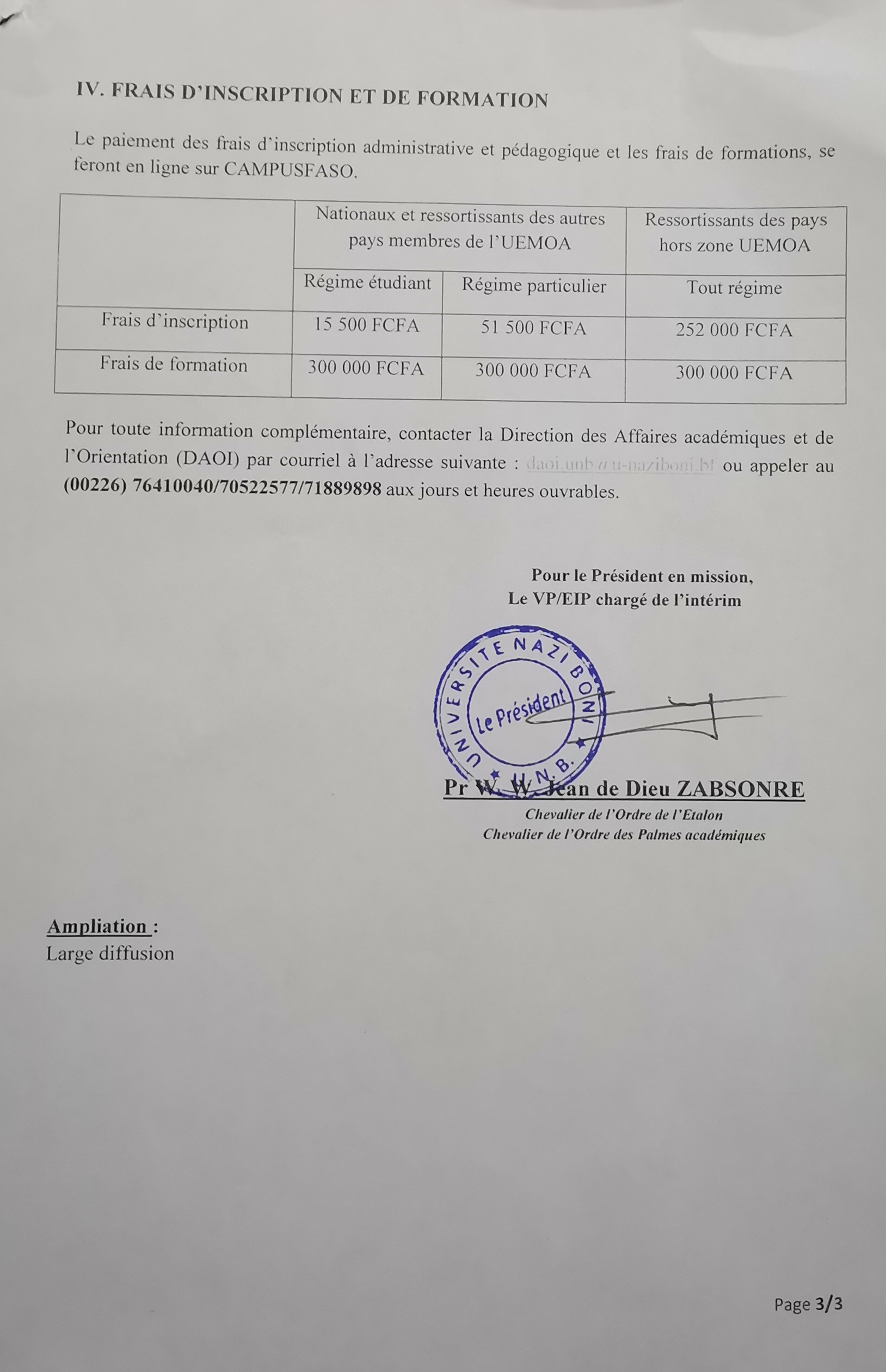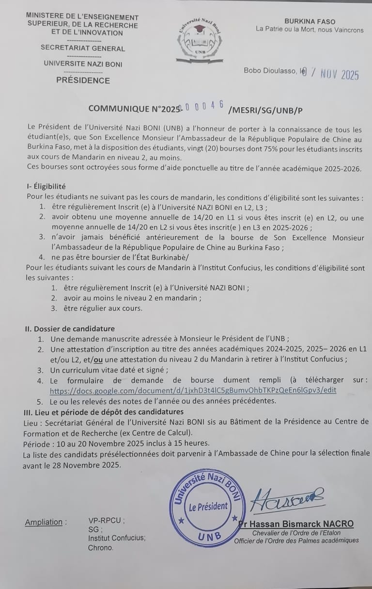 Communiqué du Président de l'UNB portant "Bourses de l'Ambassade de la République Populaire de Chine au Burkina Faso