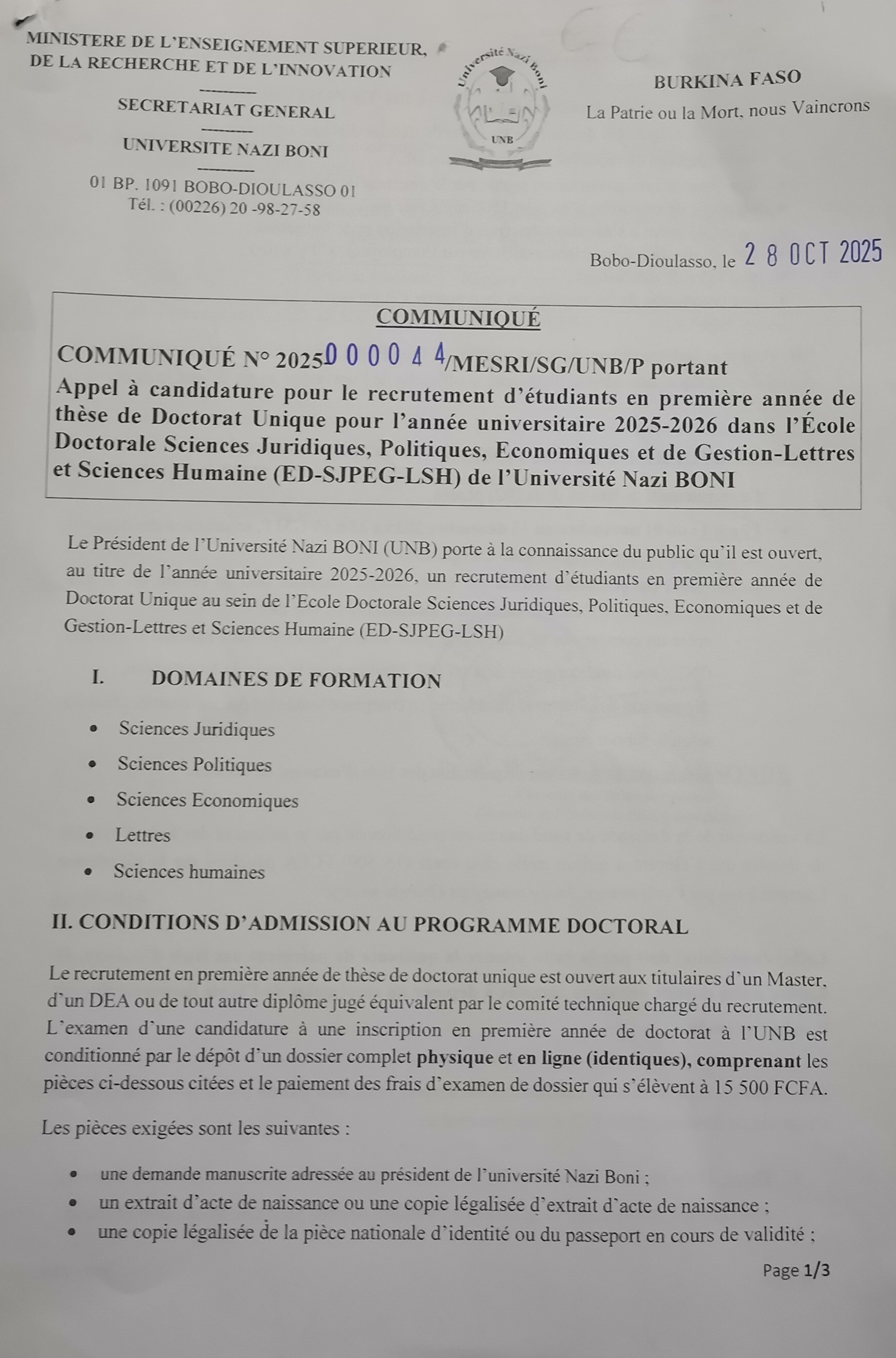 Sous le Patronage de Mme Mariama KONATE/GNANOU, Gouverneur de la Région du Guiriko et la Présidence du Pr Hassan Bismarck NACRO, Journées de la coopération et des partenaires de l'Université Nazi BONI, les 03 et 04 /12/ 2025 au CFR